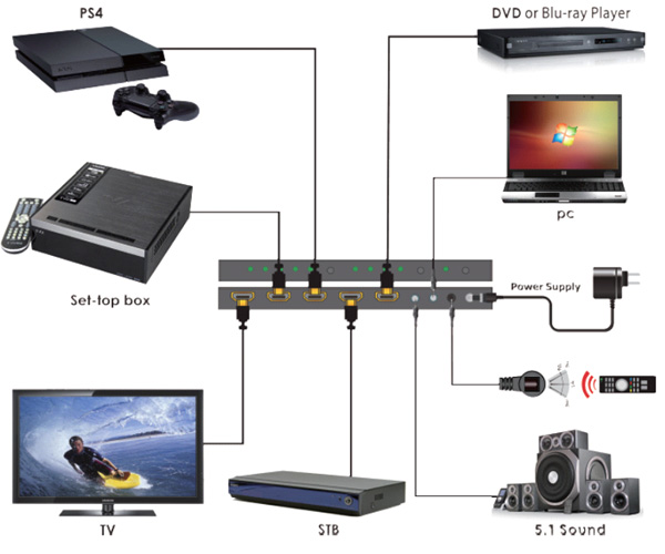 4K60 HDMI 4×1切換器支持分辨率高達(dá)4K×2K@60Hz的4路HDMI信號(hào)切換至一路HDMI輸出。支持HDMI音頻剝離功能輸出數(shù)字光纖和模擬音頻信號(hào)。支持ARC音頻回轉(zhuǎn)、10bit HDR和CEC功能??刂品绞届`活,支持前面板按鍵、IR和RS-232控制,且任意信號(hào)源都可以隨時(shí)通過紅外遙控器來控制。本產(chǎn)品采用高品質(zhì)的電路設(shè)計(jì),以確保高質(zhì)量的信號(hào)傳輸。使用新一代低功耗芯片處理方式,24小時(shí)不間斷工作,發(fā)熱量小,工作穩(wěn)定,安裝簡單,即插即用。本設(shè)備可廣泛應(yīng)用于視頻會(huì)議系統(tǒng)、廣播電視系統(tǒng)、閉路電視系統(tǒng)和電視監(jiān)控系統(tǒng)的音視頻相匹配處理設(shè)備上。
