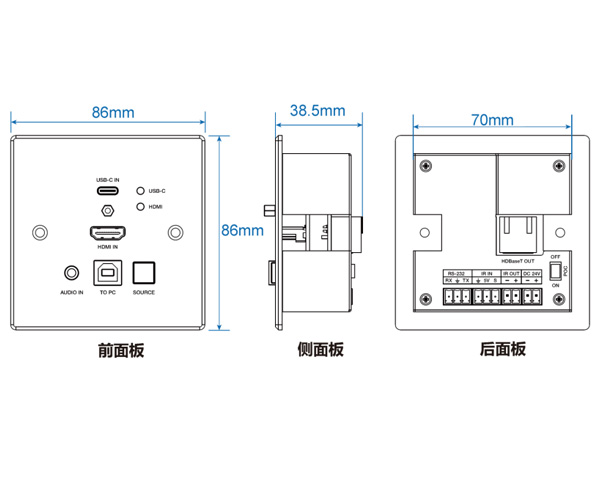 輸入:1 x HDMI IN [Type A,19-pin母座] 1 x USB-C IN [USB Type C] 1 x AUDIO IN [3.5mm立體聲迷你接口]輸出:1 x HDBaseT OUT [RJ45] 控制:1 x TO PC [USB Type B] 1 x RS-232 [3pin-3.81毫米鳳凰端子] 1 x IR IN [3pin-3.81毫米鳳凰端子] 1 x IR OUT [2pin-3.81毫米鳳凰端子] |