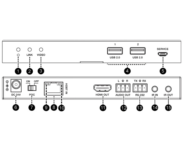 輸入:1 x HDBT IN [RJ45] 輸出:1 x HDMI OUT [Type A,19-pin母座] 1 x AUDIO OUT [3pin-3.81毫米鳳凰端子]控制:2 x USB 2.0 [USB Type A] 1 x RS-232 [3pin-3.81毫米鳳凰端子] 1 x IR IN [3pin-3.81毫米鳳凰端子] 1 x IR OUT [2pin-3.81毫米鳳凰端子] 1 x SERVICE [Micro USB] |