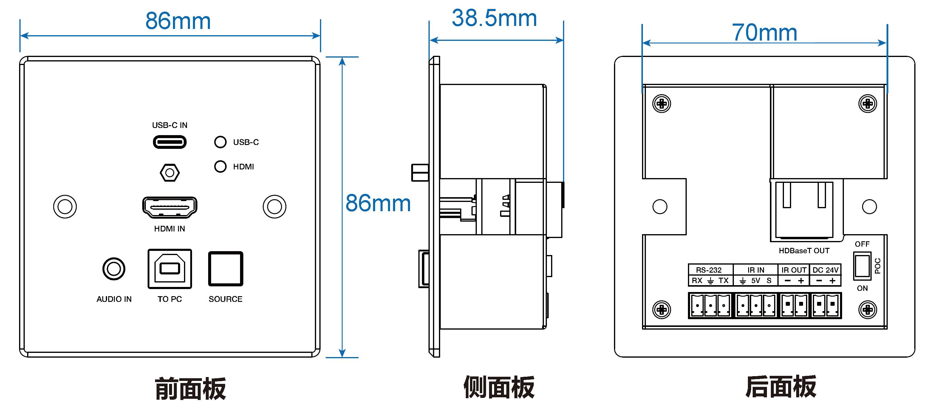 輸入:1 x HDMI IN [Type A,19-pin母座] 1 x USB-C IN [USB Type C] 1 x AUDIO IN [3.5mm立體聲迷你接口]輸出:1 x HDBaseT OUT [RJ45] 控制:1 x TO PC [USB Type B] 1 x RS-232 [3pin-3.81毫米鳳凰端子] 1 x IR IN [3pin-3.81毫米鳳凰端子] 1 x IR OUT [2pin-3.81毫米鳳凰端子] |