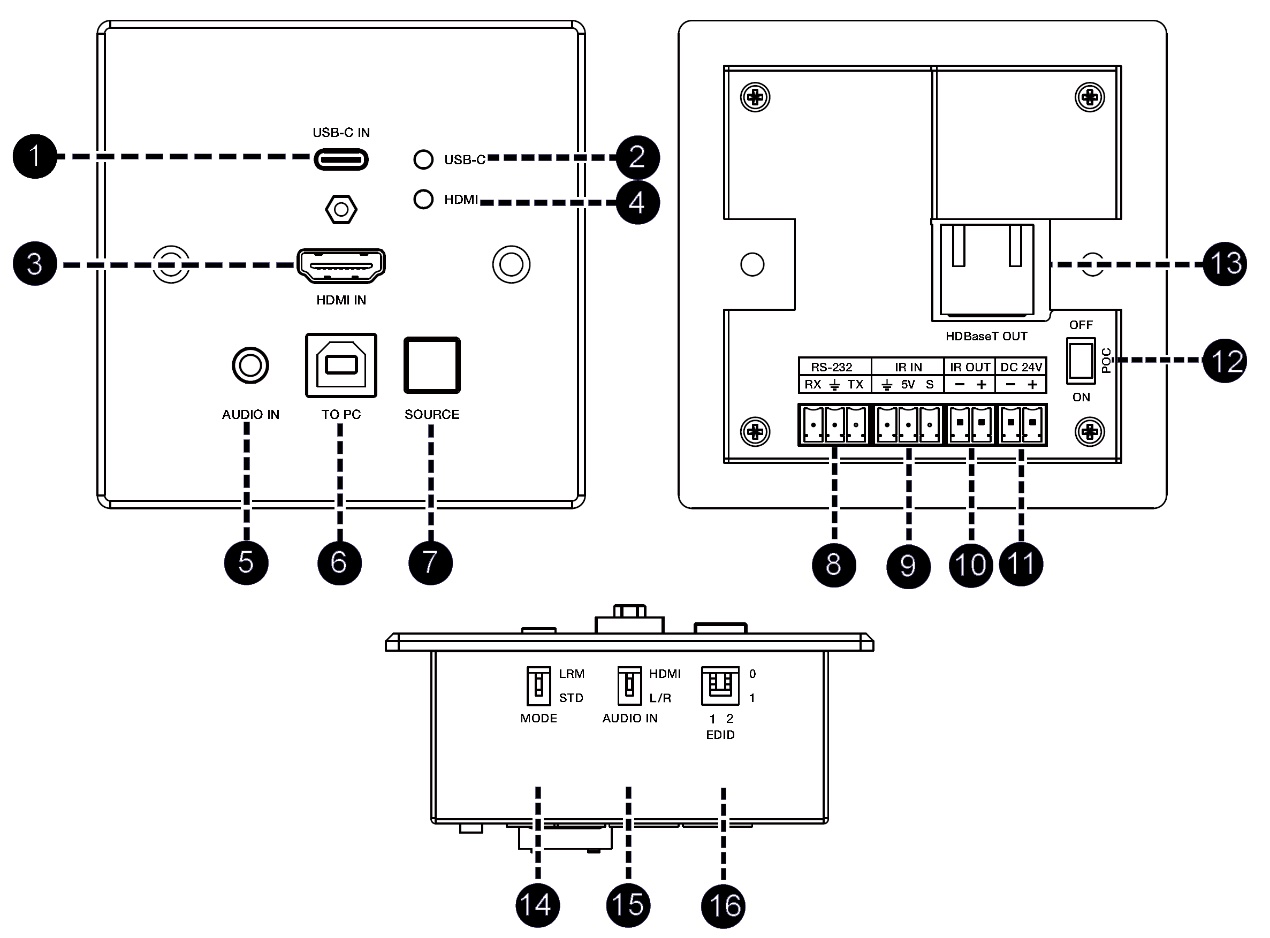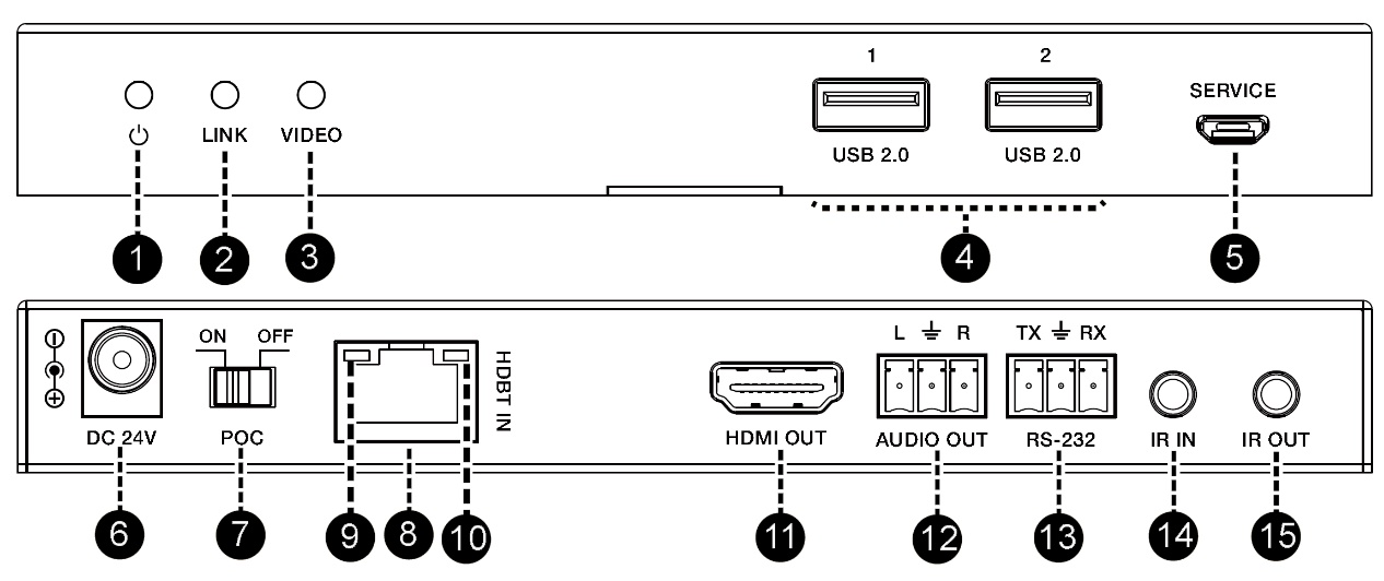 輸入:1 x HDBT IN [RJ45] 輸出:1 x HDMI OUT [Type A,19-pin母座] 1 x AUDIO OUT [3pin-3.81毫米鳳凰端子]控制:2 x USB 2.0 [USB Type A] 1 x RS-232 [3pin-3.81毫米鳳凰端子] 1 x IR IN [3pin-3.81毫米鳳凰端子] 1 x IR OUT [2pin-3.81毫米鳳凰端子] 1 x SERVICE [Micro USB] |